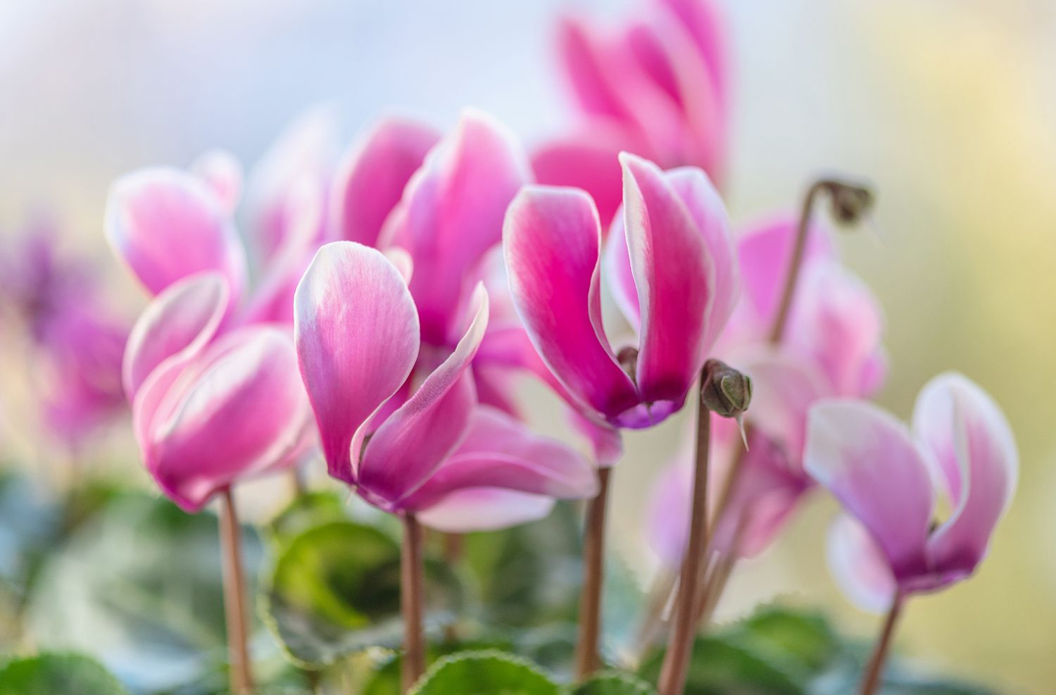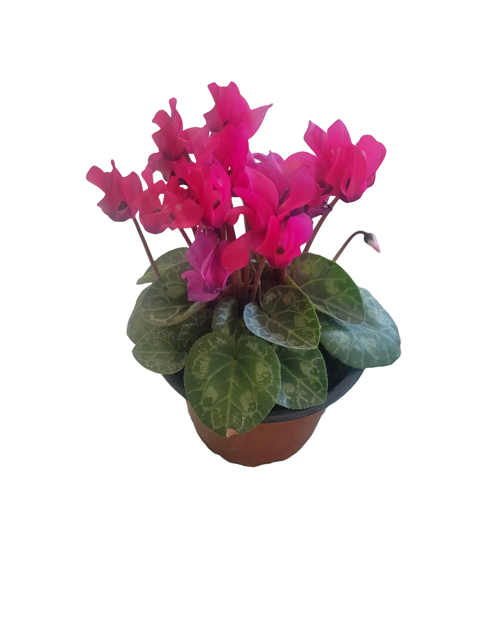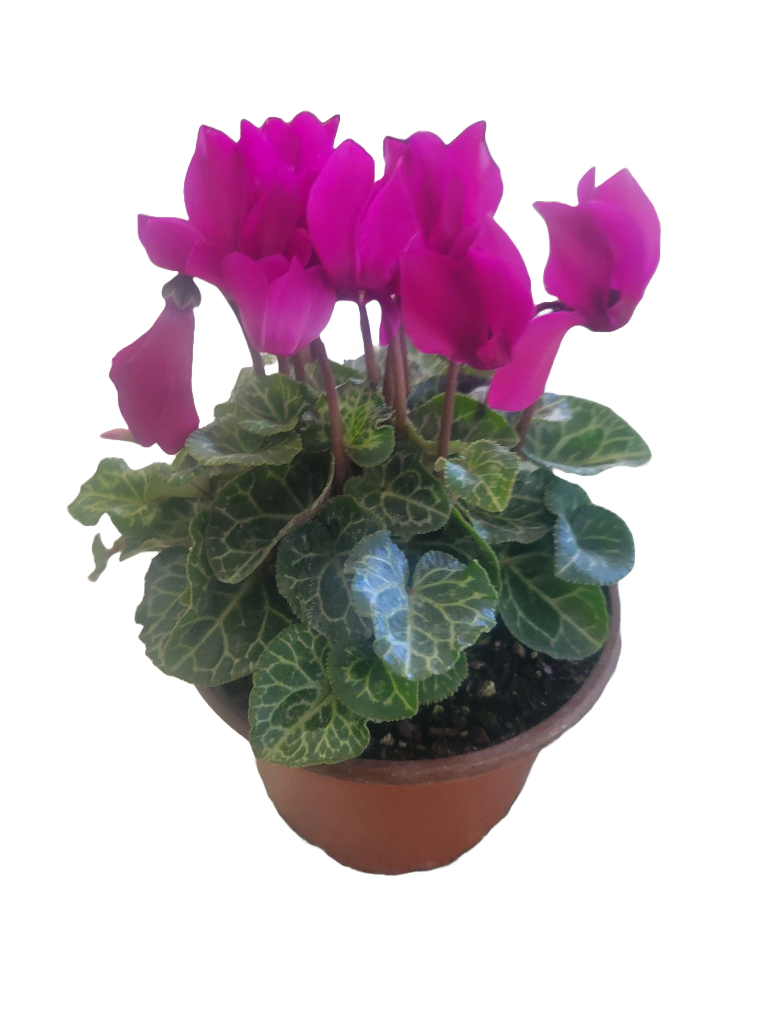 Florist’s cyclamen, or indoor cyclamen, are popular house plants grown for their large, showy winter flowers, in shades of white, pink and red. The flowers may be frilly or scented, and are set off by marbled, heart-shaped leaves.