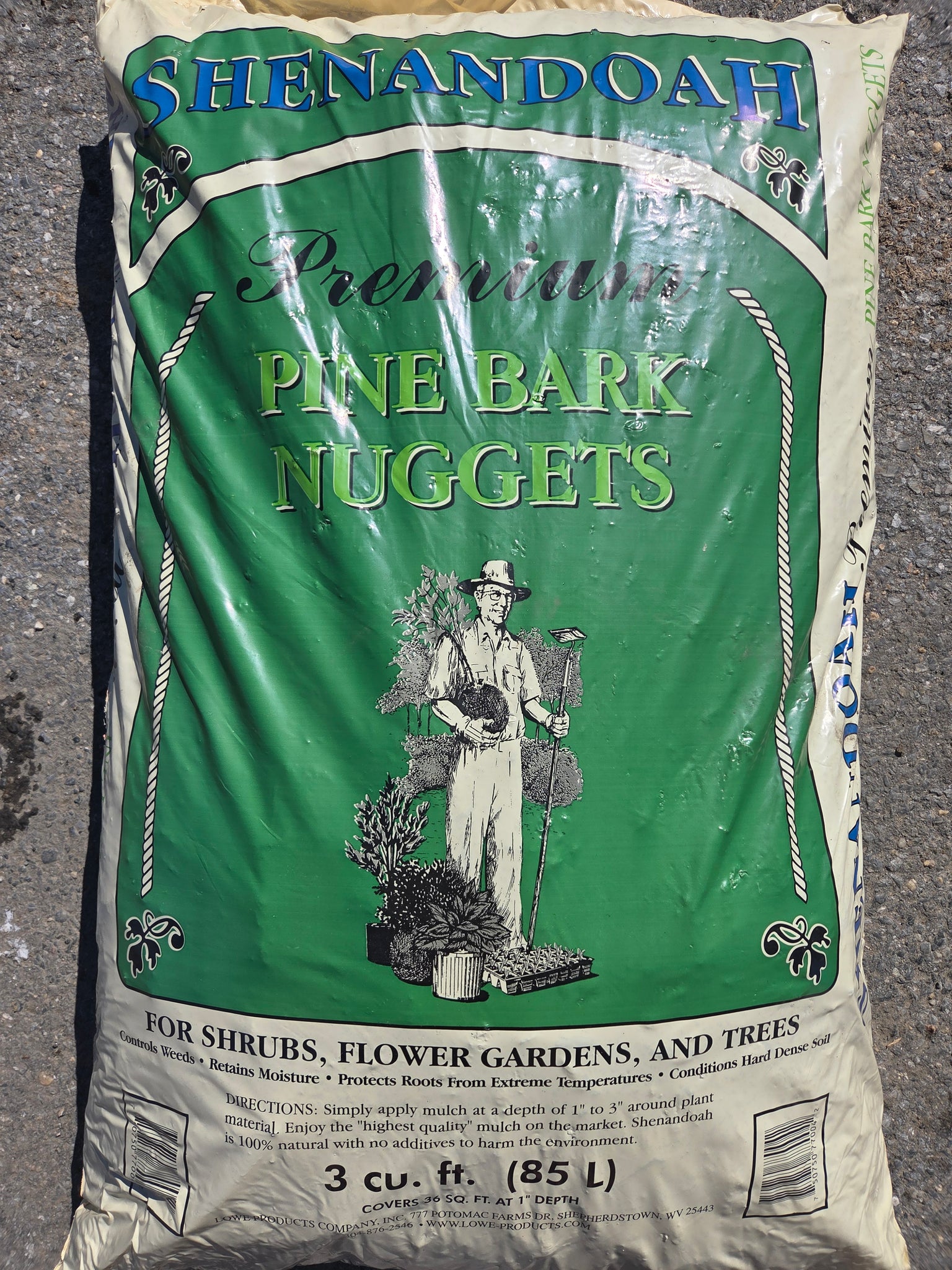 Pine Bark Nuggets are the size of a silver dollar. They are an all natural product. They have been processed through a screen to remove fine material and sticks. They are a beautiful alternative to other mulches. Premium LARGE Pine Bark Nuggets come in a 3 Cubic Foot Bags. Recommended depth is 2 - 3 inches.